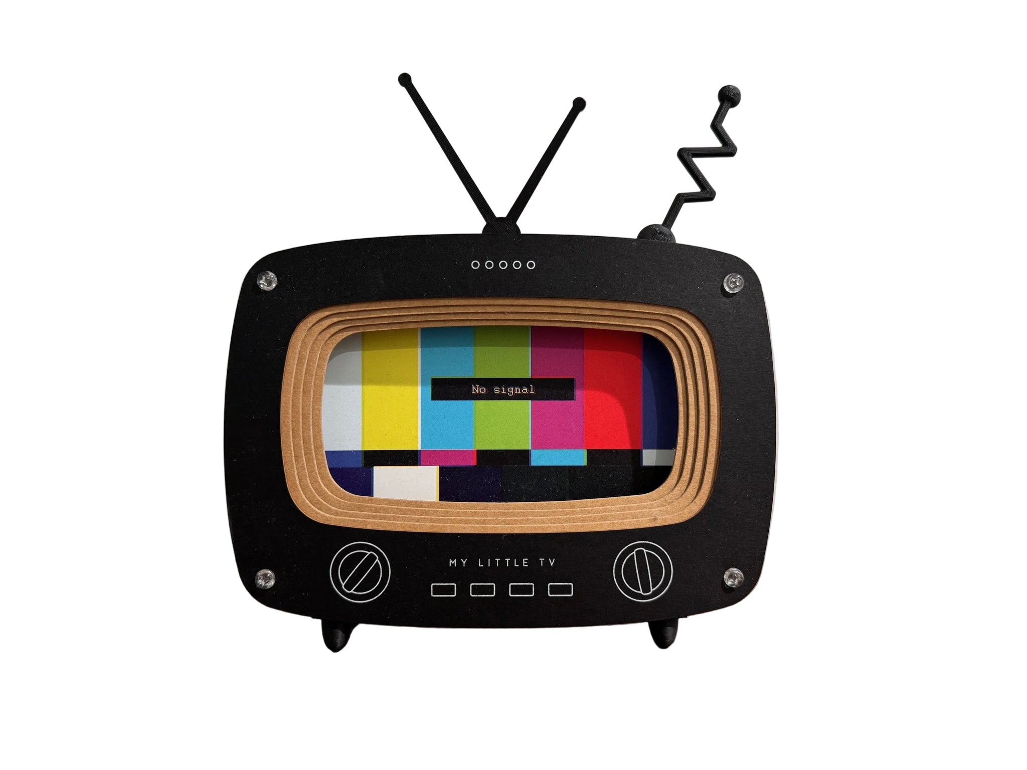My Little TV, the magical mobile phone stand that turns your smart phone into a retro TV set! How magical and cool is that! Made of eco-friendly color board and corrugated cardboard, this laser-cut cardboard facade with 3D printed legs and antenna can also be used as a photo frame if you're the last remaining individual without a smart phone.
